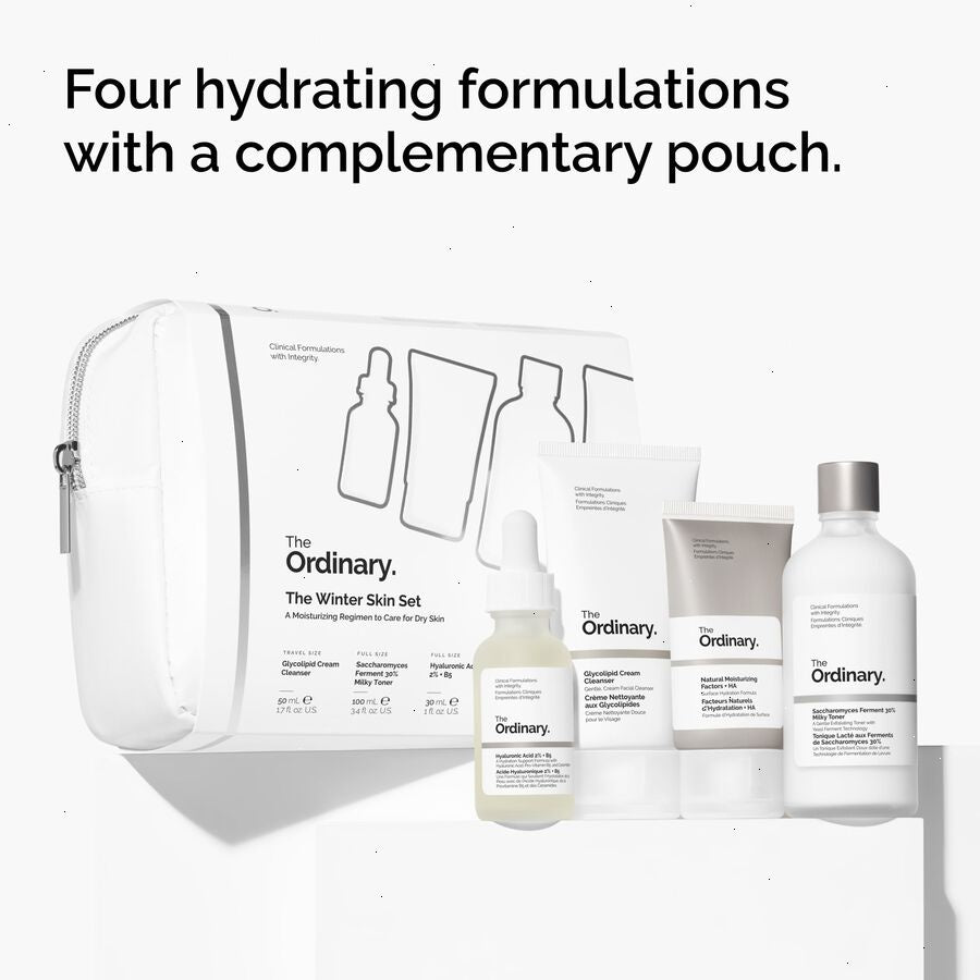 The Winter Skin Set offers a full regimen to target dull, dry and uneven skin texture with products that offer hydration and skin barrier support. Includes a complementary pouch to store the formulations for your daily regimen.